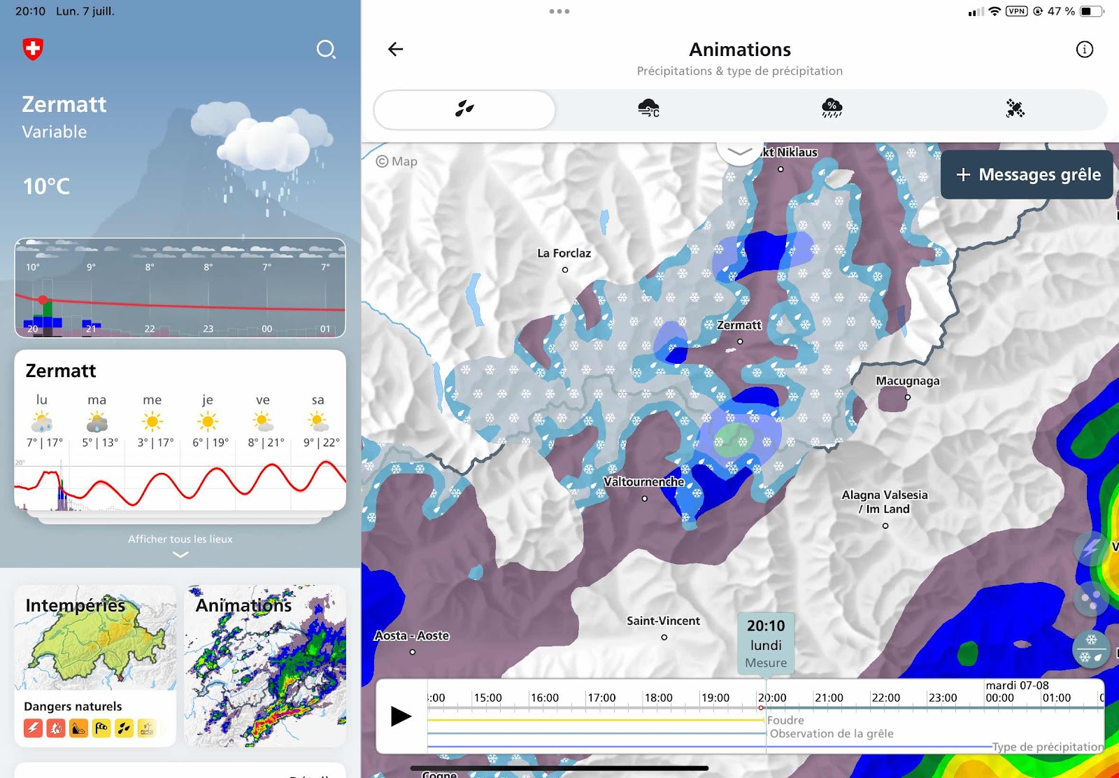 Comme je suis à reprendre mon retard de rédaction, voici un changement drastique des 35C que j’ai eu les deux premières semaines en Suisse. Hier, un beau 19C à Zermatt et 12C en altitude, parfait pour rouler sans avoir chaud. Ce matin, j’ai roulé à 8C à 2288m alors qu’il faisait -4C à 3090m. Ce soir, il neige dans les hauteurs. Je n’ai pas de photos puisqu’il pleuvait des cordes sur Zermatt et les sommets étaient sous les nuages. J’ai dû faire un sprint entre le restaurant et l’hôtel sous la pluie battante après souper.