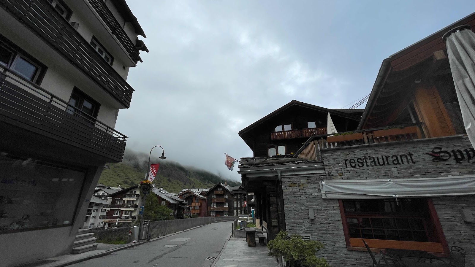 Pour atteindre Sunnegga, c’est un train comme un métro, il y a deux voitures, une à chaque extrémité de la ligne. Les voitures sont à 45 degrés dans l’une ou l’autre des deux stations, et le poids de l’une sert de contrepoids à l’autre pour le déplacement. Ça prend environ 5 minutes pour arriver à destination. Une fois à l’extérieur, le temps n’a pas changé, j’ai la tête dans les nuages, et ce sera le cas pour la moitié de ma première descente sur une piste aménagée en 2018. 6km à zigzaguer jusqu’à 1755m, et le reste se fait sur une petite route jusqu’à Zermatt. Au total, c’est 9km du début de la trail jusqu’au village. Sur la descente du dernier tronçon, le bar à Champagne est toujours fermé, un peu tôt pour s’y arrêter de toute façon.